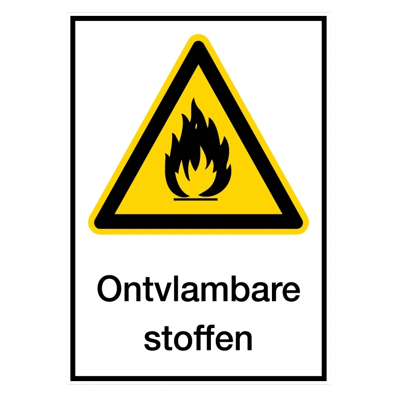 Ontvlambare stoffen stickers worden geleverd als rechthoekige stickers.Deze worden geleverd als witte stickers met daarop een geel met zwart pictogram en daaronder duidelijke tekst die waarschuwt voor gevaar met ontvlambare stoffen.