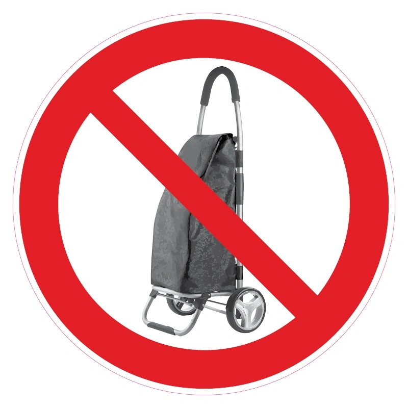 Verboden voor boodschappentrolleys stickers worden geleverd als cirkelvormige stickers.Het verbodsteken is altijd cirkelvormig en heeft een rode rand en dwarsstreep. De achtergrond is wit en het pictogram dat het verbod uitbeeld is zwart.